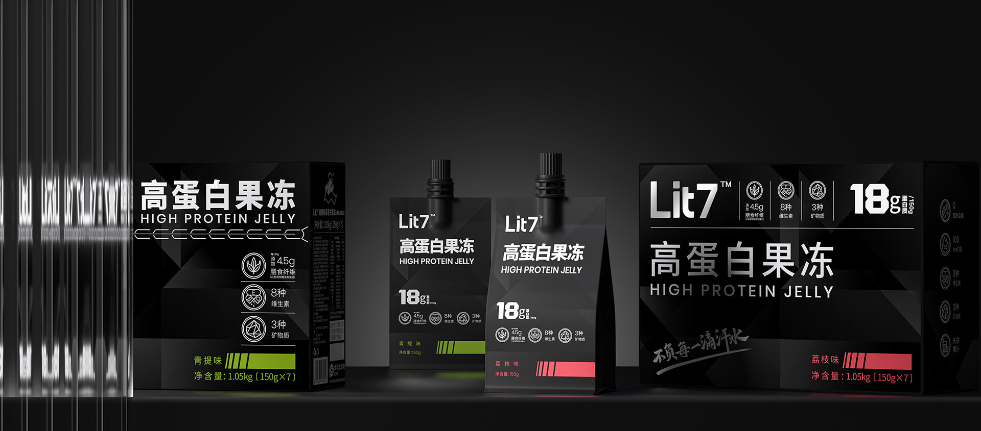 Lit 7以解决健身和减脂人士补充蛋白质为目标,专注打造蛋白质类健康食品。通过中英文加图形的形式,进行LOGO设计。品牌英文字体进行艺术化处理,配合笔画的特殊处理,既具有力量感而又不失英文的识别性与美感。奔跑的小人元素成为整个视觉的点睛之笔,表现了运动、活力、燃的品牌气质。包装以符合健身和减脂人士审美的酷黑颜色作为主色调,将功能标签及卖点进行图标化视觉呈现,帮助消费者迅速捕获产品信息。